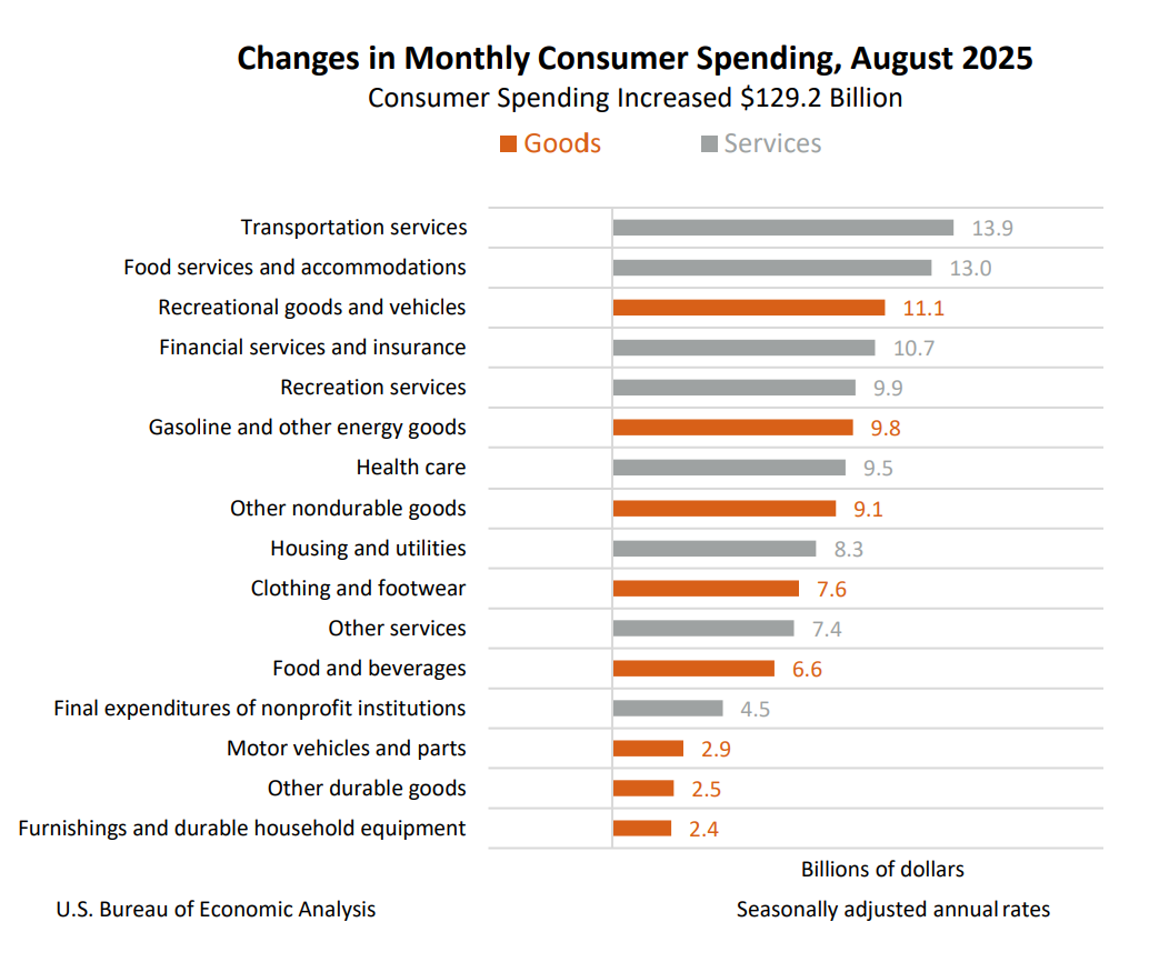 The U.S. economy showed stronger momentum in the second quarter than previously reported. Last week, the Bureau of Economic Analysis (BEA) revised the GDP growth upward to 3.8% from the initial estimate of 3.3%, driven by solid gains in both consumer spending and business investment. Consumer expenditures rose 2.5%, while business investment jumped 7.3%, reflecting confidence from firms and households alike. This momentum extended into August, when consumer spending increased 0.6%. Much of the growth came from transportation services, food services, and recreational goods and vehicles, while purchases of big-ticket household items such as furniture and motor vehicles remained sluggish. Several months of robust spending have provided a reliable foundation for economic growth heading into the third quarter.