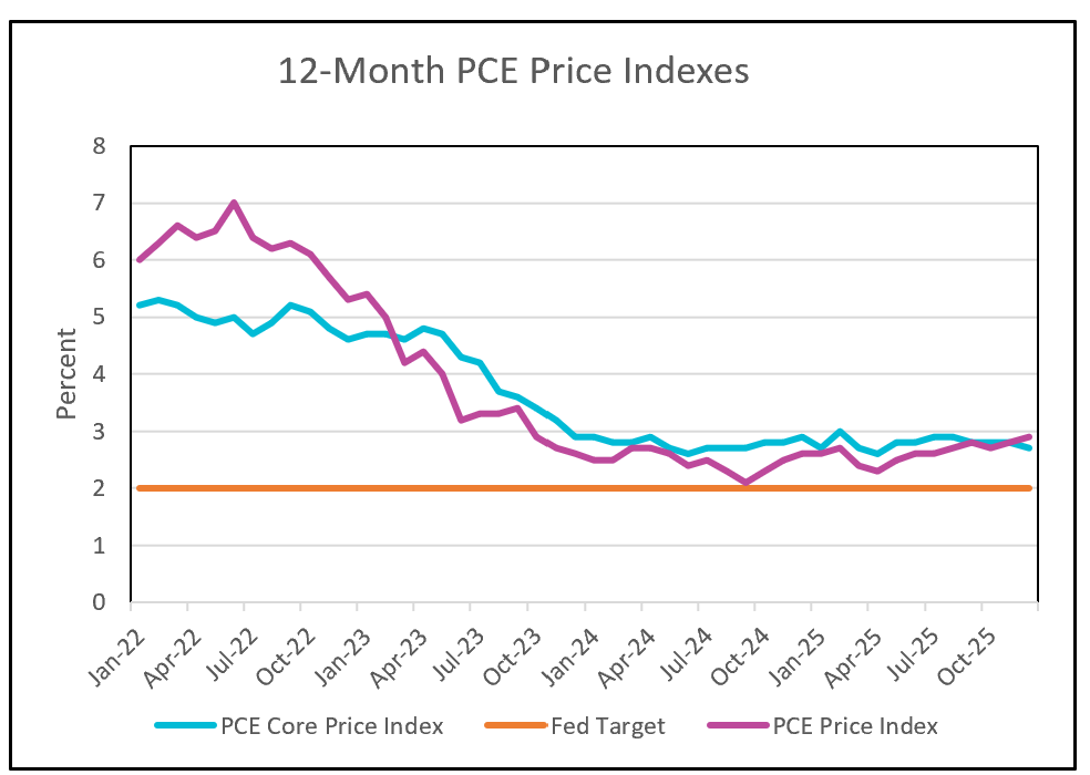 Inflation measured by the PCE price index accelerated: the headline PCE rose 0.4% in December (after 0.2% in November), the largest monthly increase since February 2025, and the core PCE (excluding food and energy) also jumped to 0.4% monthly. Over the past 12 months, the headline PCE was up 2.9% and core PCE was up 3.0%—both the highest year-over-year readings since early 2024. The PCE has been running above the more widely published consumer price index (CPI), partly because the CPI places a heavier weight on housing and car prices; rental and auto price increases have been decelerating, producing a contrast between the rising PCE and the modest drop in the CPI (December CPI 2.7%, January CPI 2.4%).