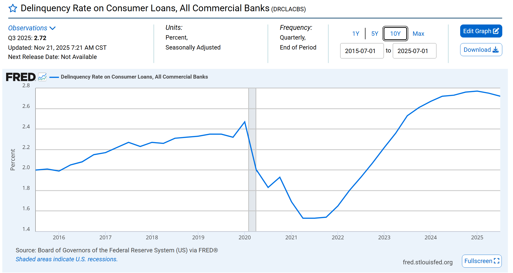 Income growth has improved modestly but has struggled to keep pace with inflation, particularly for lower-income households. Personal income rose 0.1% in October and 0.3% in November, with disposable income posting the same gains. After adjusting for inflation, income dipped slightly in October before recovering somewhat in November, though lower-income families continue to fall behind. Wages and salaries increased 0.4%, a gain that only barely kept pace with rising prices. As a result, many households are increasingly stretched, saving less and relying more on borrowing to maintain their standard of living. Many are dipping into their savings or going deeper into debt. The personal savings rate – measured as savings as a percentage of disposable income – has dipped to 3.5% from 5.5% as recently as April. Between 2015 and 2019, households saved 7.6% of their disposable income. Another indication of hardship is delinquency, which is now at its highest level in 12 years.