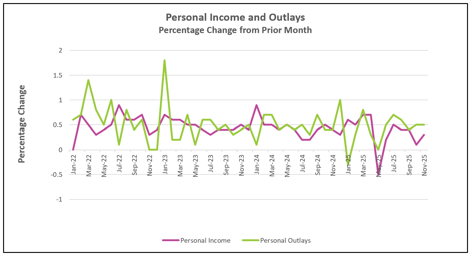 The Bureau of Economic Analysis (BEA) published October and November’s statistics in this release because the government shutdown delayed each. Here are the key highlights from its report, Personal Income and Outlays.