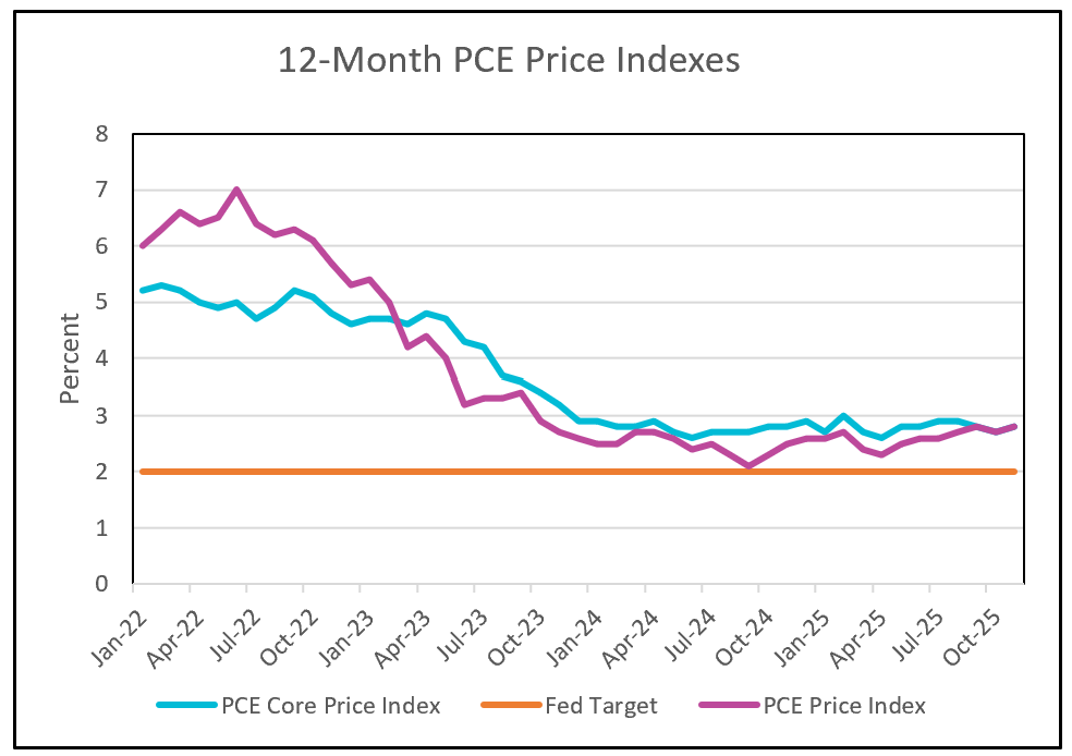 Inflation remains persistent as key price measures increased slightly in November, continuing to impact household budgets. The Fed’s preferred inflation gauge, the personal consumption expenditures (PCE) price index, rose to a 2.8% year-over-year pace in November from 2.7% in October, staying above the Fed’s 2% target. Since President Trump took office, the annual inflation rate has increased by 0.2%. On a monthly basis, both the headline and core PCE indexes increased 0.2% in October and November. While goods inflation slowed earlier in the year, it has picked up again since President Trump imposed tariffs, adding further pressure on prices.