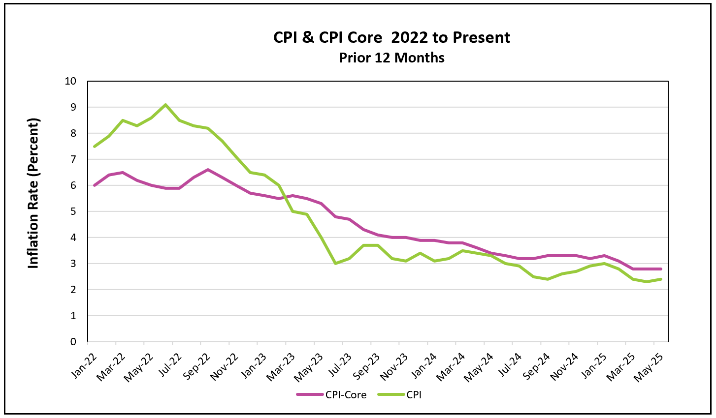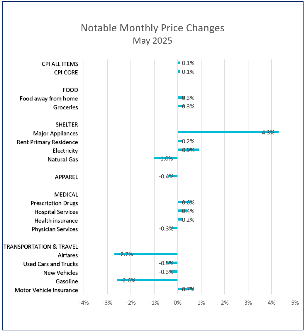 May’s inflation data brought a mixed message for policymakers and consumers. Headline inflation cooled slightly, with monthly price increases falling from 0.2% in April to 0.1% in May. Despite the moderation, the all-items 12-month inflation rate edged up due to the rising prices of groceries and some imported goods. These increases were partly counterbalanced by falling gasoline prices and a continued decline in shelter costs. Notably, the core CPI, which excludes volatile food and energy prices, rose 2.8% over the past year—unchanged for the third month in a row, suggesting underlying price pressures are stable but still elevated.