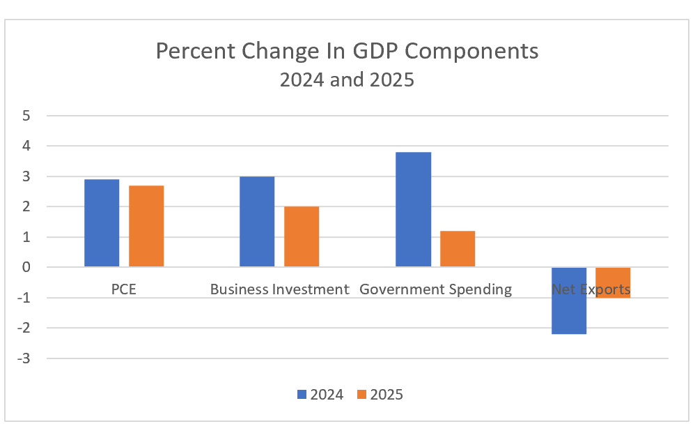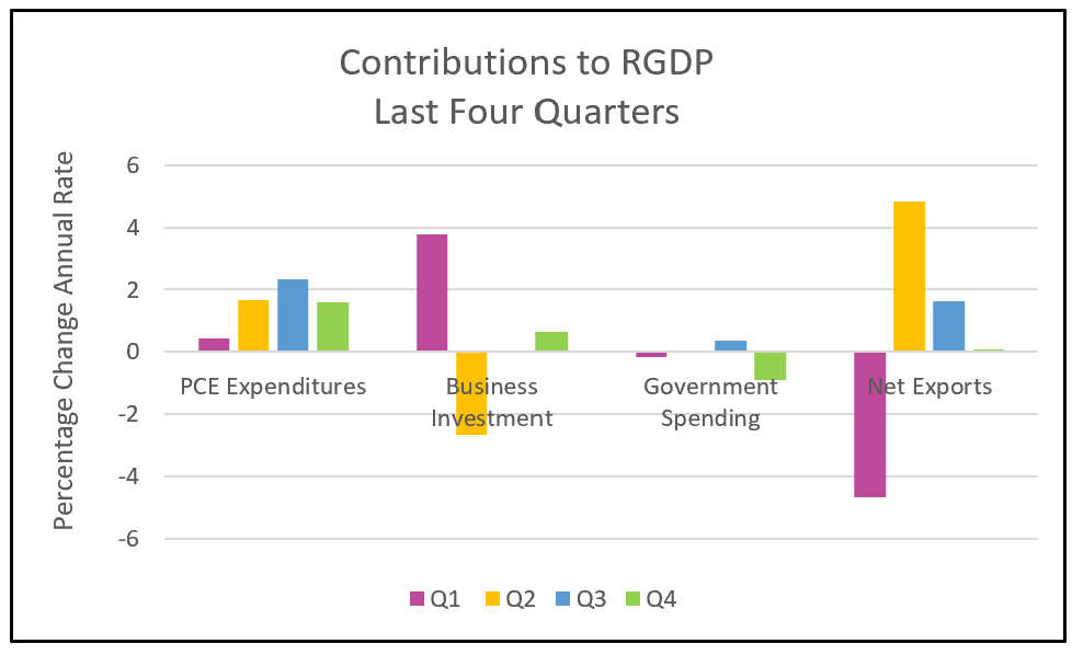 Despite the slower pace, consumer and business spending still accounted for the majority of fourth-quarter growth. Consumer spending expanded at a more moderate rate, resulting in a smaller contribution to RGDP. Notably, all of the increase in consumer spending came from services, particularly health care, while goods sales edged lower. Health care alone contributed 0.63 percentage points to the 1.4% overall growth rate, highlighting how dependent current expansion has become on a narrow set of service industries. A slight decline in imports provided a technical boost to output. However, falling government spending and weaker exports offset part of those gains.