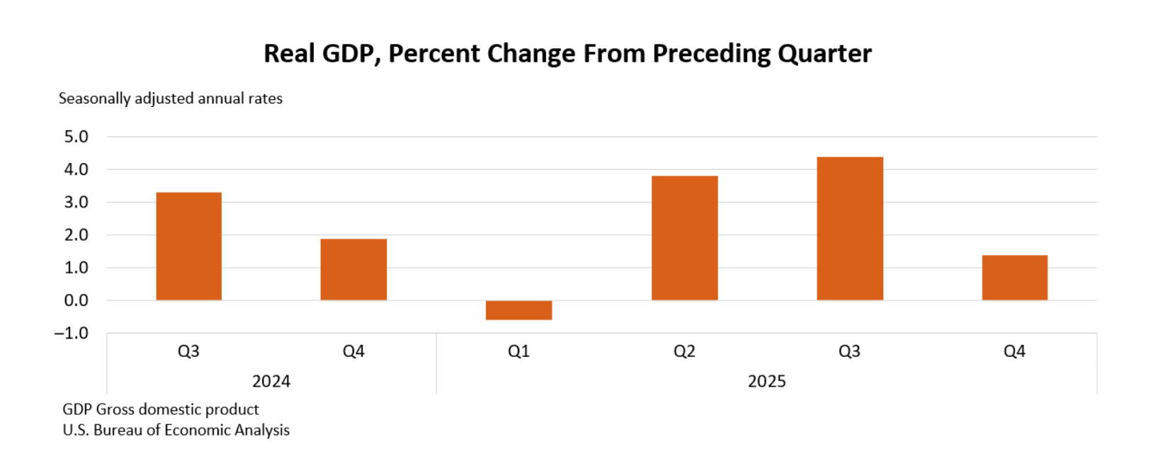 RGDP, as reported by the Bureau of Economic Analysis’s advance estimate, increased at an annual rate of 1.4% in the fourth quarter, a sharp slowdown from the 4.4% pace recorded in the third quarter. The deceleration reflected a combination of factors, most notably the federal government shutdown in October and November and a pullback in consumer spending on goods. The shutdown alone accounted for roughly one percentage point of the decline in quarterly growth, underscoring the significant drag that disruptions in federal operations can have on overall economic activity.