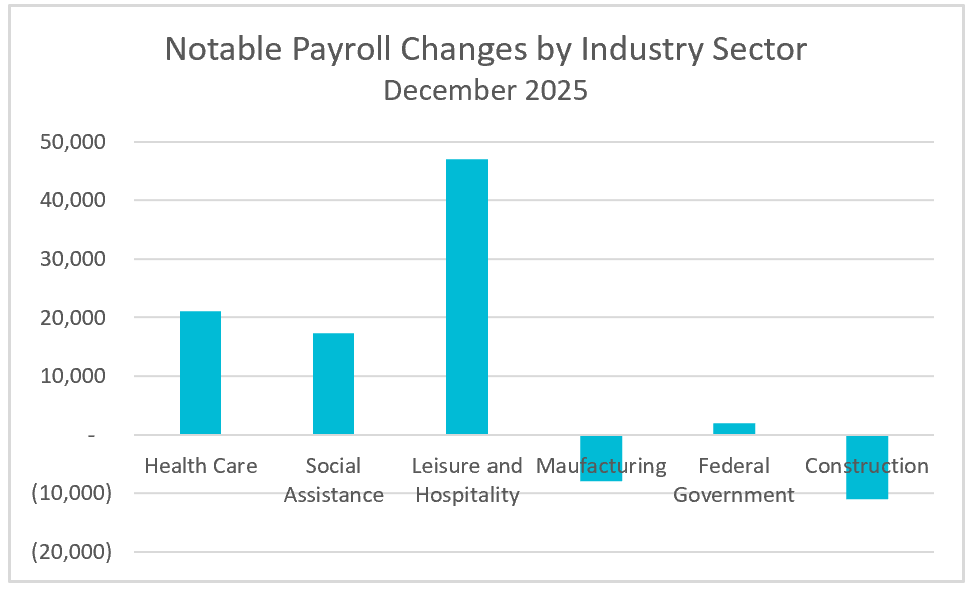 Job gains in December remained heavily concentrated in health-related fields. Healthcare companies increased their payrolls by 21,000 workers, while social assistance added 17,000 new workers. Over the full year, health care and social assistance accounted for 713,000 of the 733,000 private-sector jobs created, highlighting how immune these industries tend to be to business cycles. In contrast, retail trade was the largest loser in December, shedding 25,000 jobs.