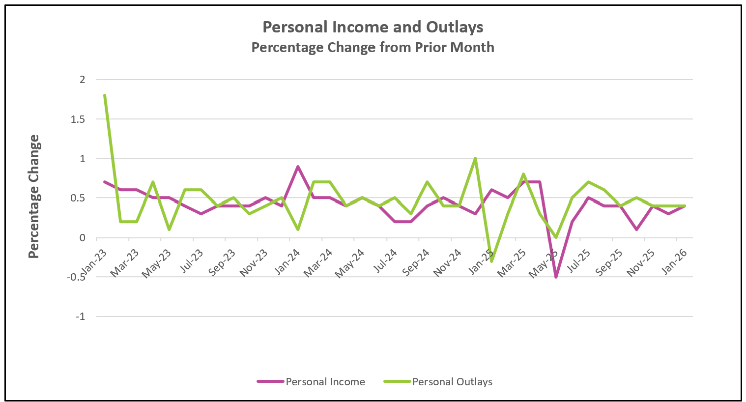 Inflation dynamics remain a central concern for policymakers. The core PCE price index rose 3.1% over the past year, remaining well above the Federal Reserve’s 2% target and continuing an upward trend since mid-2025. Notably, the PCE measure has recently outpaced the more widely followed CPI, partly because slowing rent increases have a smaller impact on PCE. Additionally, rising goods prices since November suggest that tariffs may be contributing to upward price pressures.