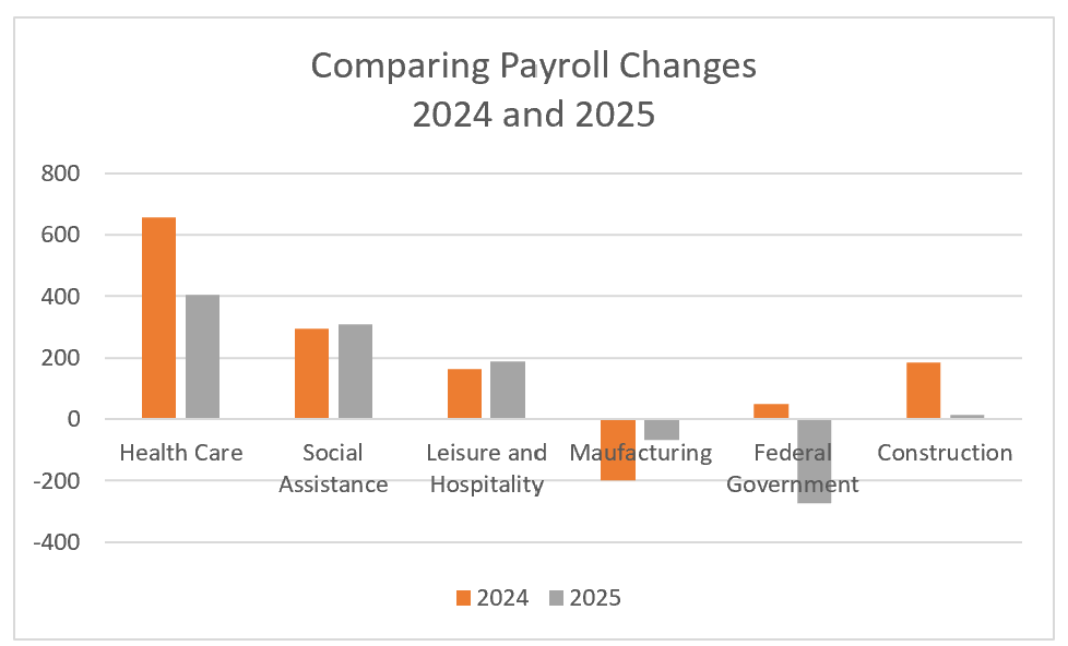 Federal government employment also increased modestly, rising by 2,000 in December; however, federal payrolls have decreased by 277,000 since December 2024, following the initiation of broad government cutbacks. The graph below compares increases in the sectors we follow the most closely in 2024 and 2025.