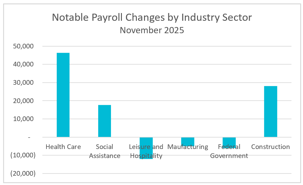 Key takeaways from the Bureau of Labor Statistics (BLS) report, The Employment Situation – November 2025, include: